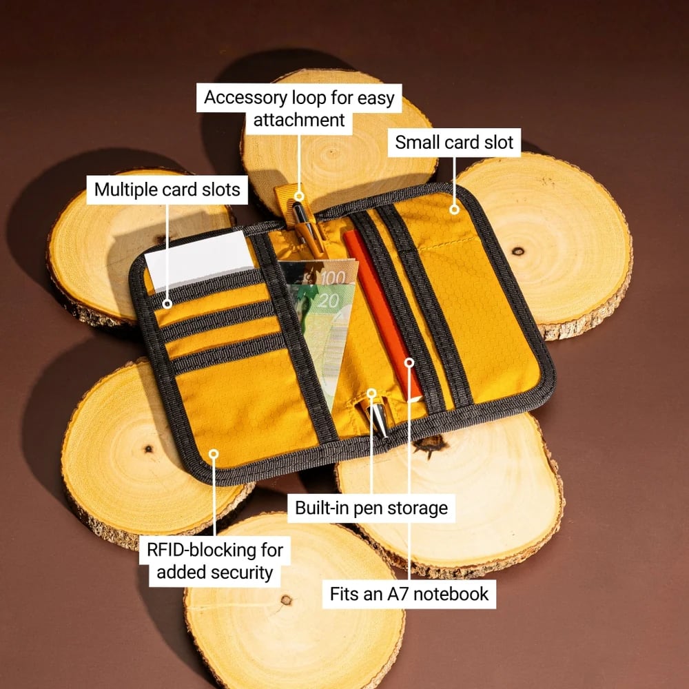 Met ruimte voor meerdere pasjes, contant geld, een pen en een A7 notitieboek biedt deze compacte organizer verrassend veel opbergruimte zonder bulk.
