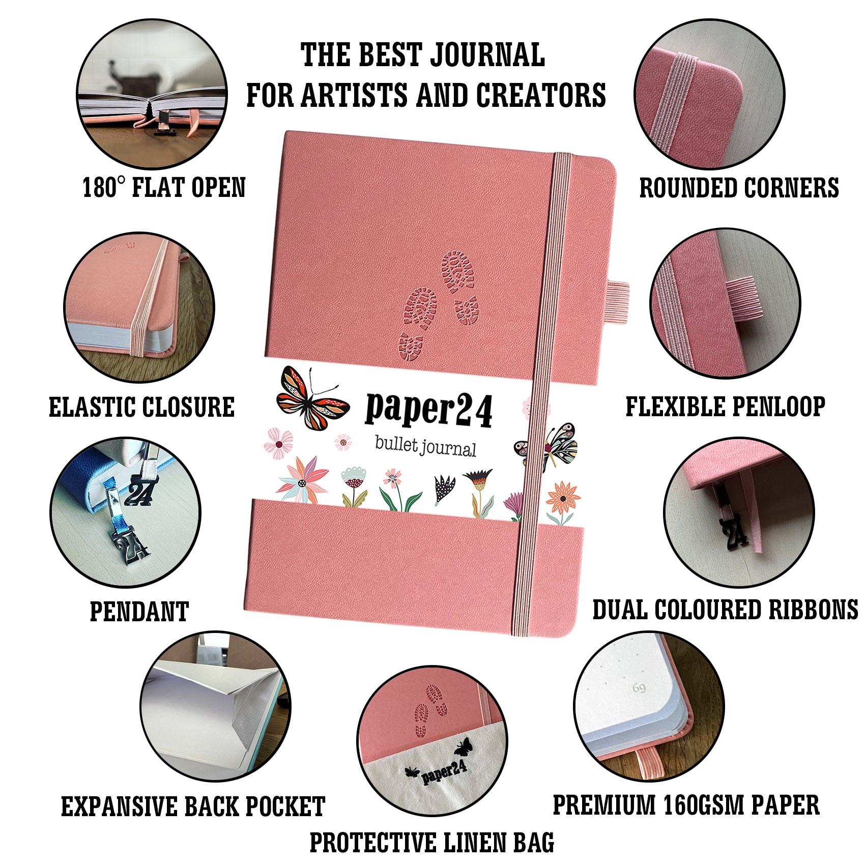 De Paper24 Bullet Journal heeft 160 grams, dotted (puntjes), hagelwit papier. Dé droom van iedere bullet journal fan. De bullet journal is handgebonden zodat het perfect open blijft liggen. Ideaal om je creatie te fotograferen en te posten op social media.