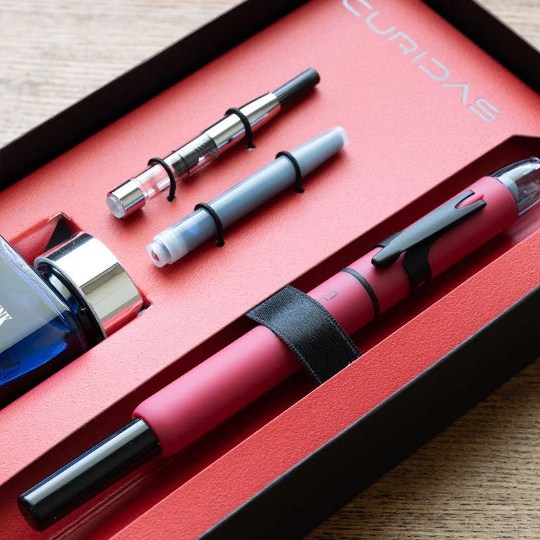 Ervaar het ultieme schrijfgenot met de Platinum Curidas Limited Edition set, die exclusiviteit en innovatie combineert in een prachtig ontwerp. Deze unieke set bevat een Platinum Curidas vulpen in een stijlvolle matrode kleur, voorzien van een stalen penpunt. Ook zit er een 20 ml inkt flesje, een inktpatroon en een converter bij.