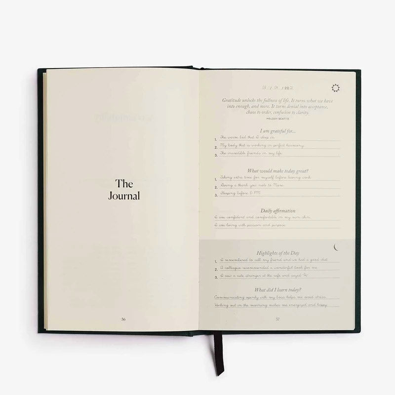 Dankzij de duidelijke prompts zoals “waar ben ik dankbaar voor?”, “wat zou deze dag geweldig maken?” en “wat kan ik vandaag verbeteren?”, begeleidt hij je richting meer zelfbewustzijn en groei. De journal is vervaardigd met duurzame materialen: 100% gerecycled FSC-papier, linnen omslag, katoenen binding en een lint als bladwijzer.